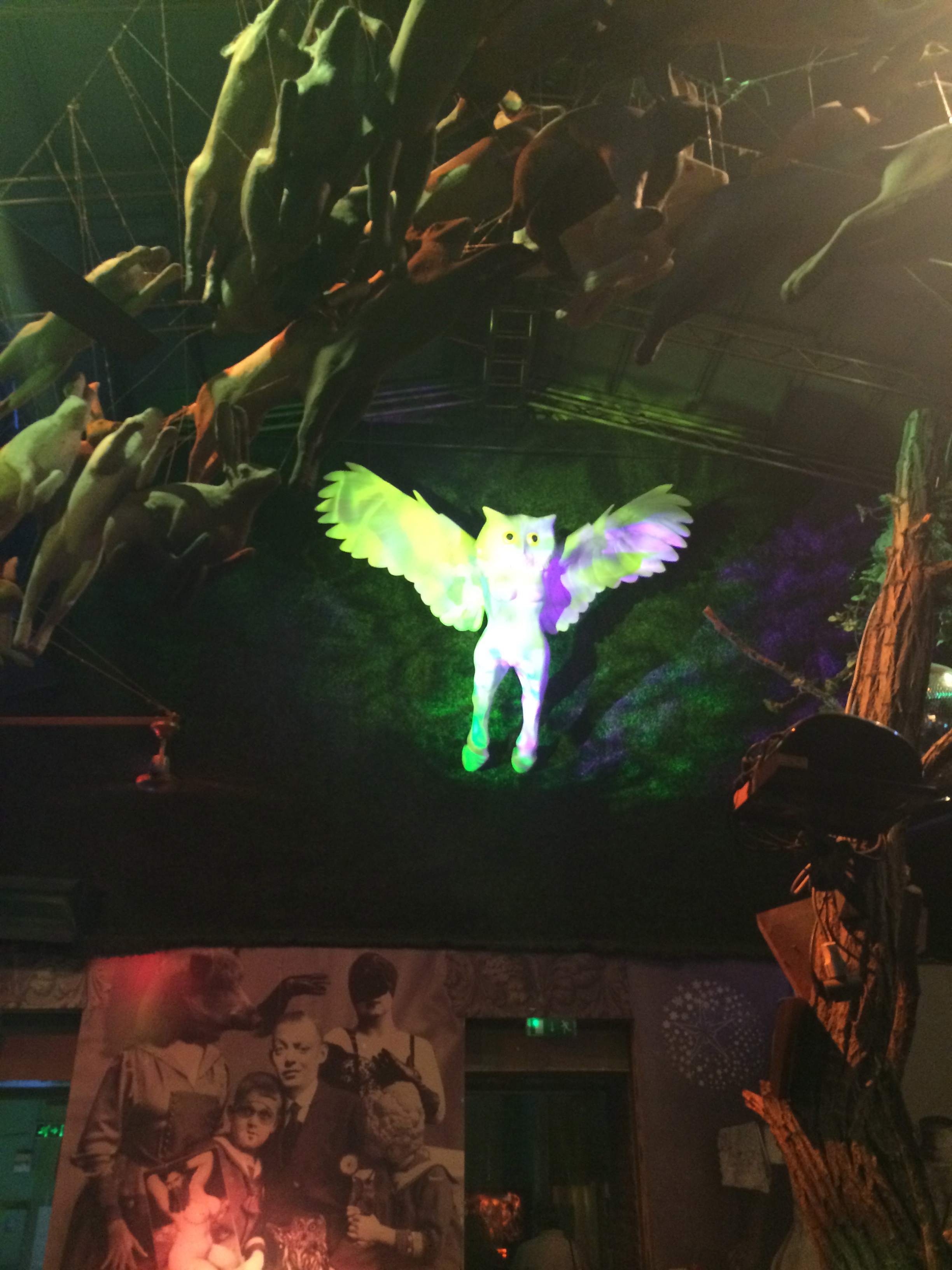 The strangest, coolest ruin pub we visited was Instant. Here a row of running rabbits hangs between the first floor and second floor balcony, a large white owl with the body of a woman overlooks the courtyard from high on the wall, and rooms are decorated by artwork I can only describe as the combination of photoshop and acid. Take a look at the photo below, and notice some of the things about the picture of the family on the wall that are just a little off….